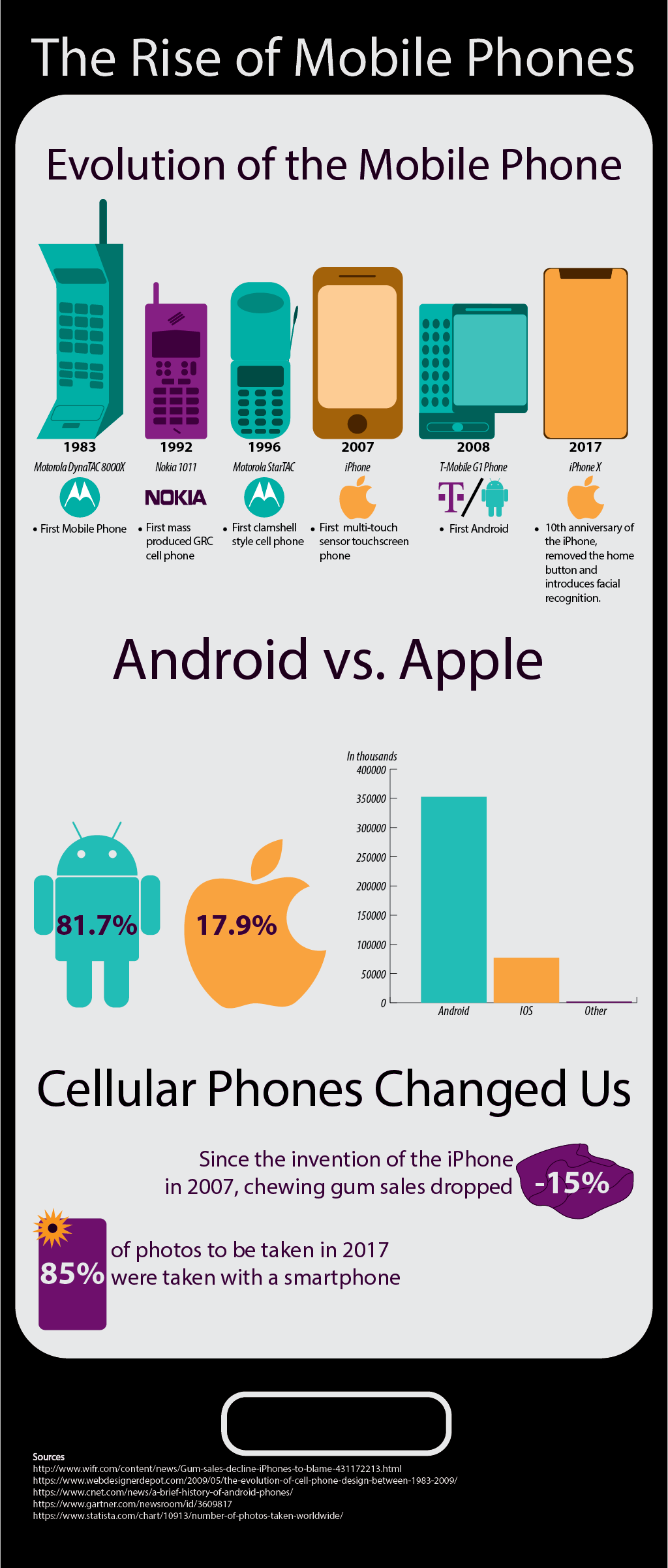 Infographic briefly shows the evolution of the mobile phone from 1983 until 2017, What operating systems are used, and some ways the Mobile phone has changed us.